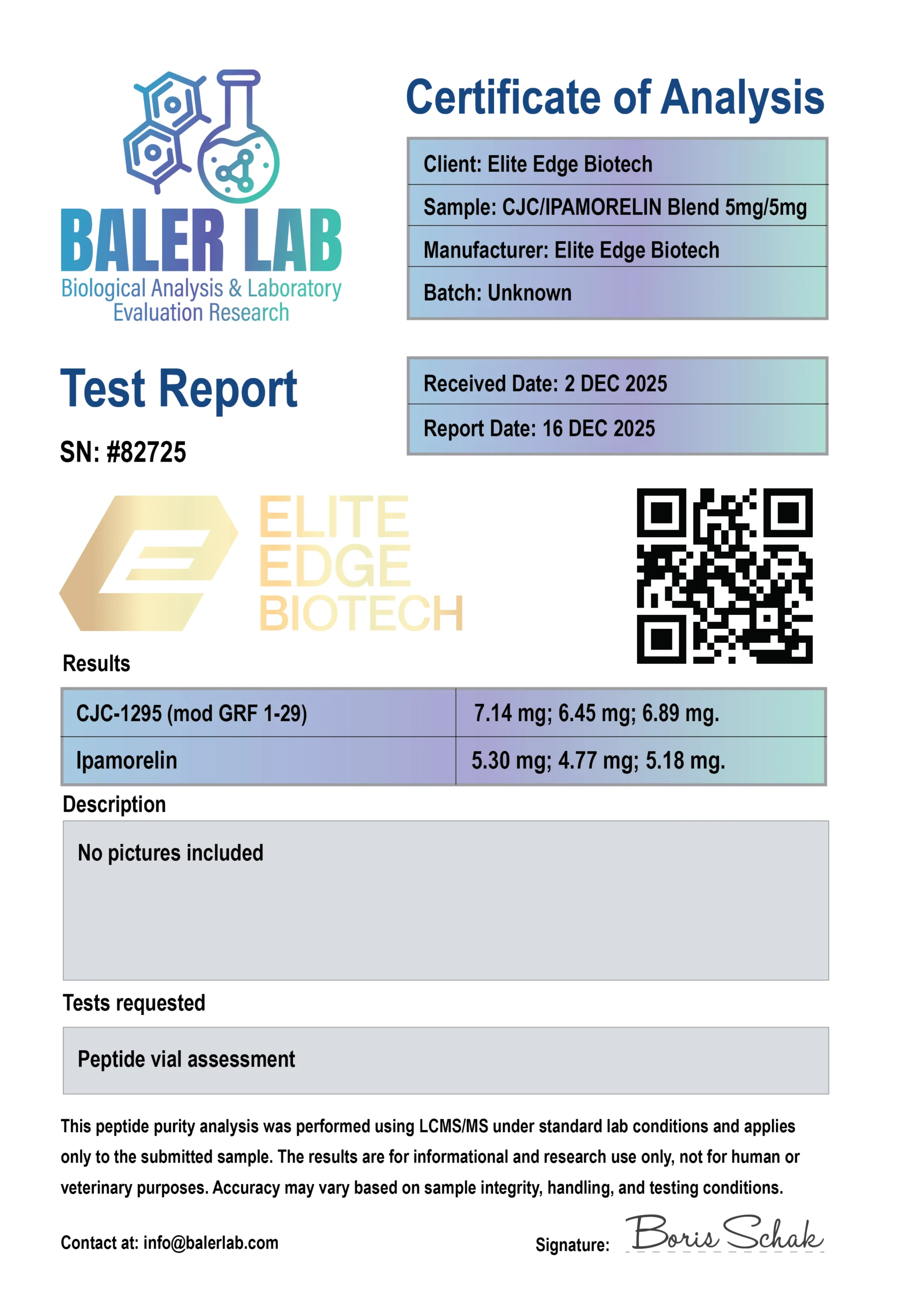 Each batch includes a certificate of analysis provided by an independent third party laboratory based in the US.”