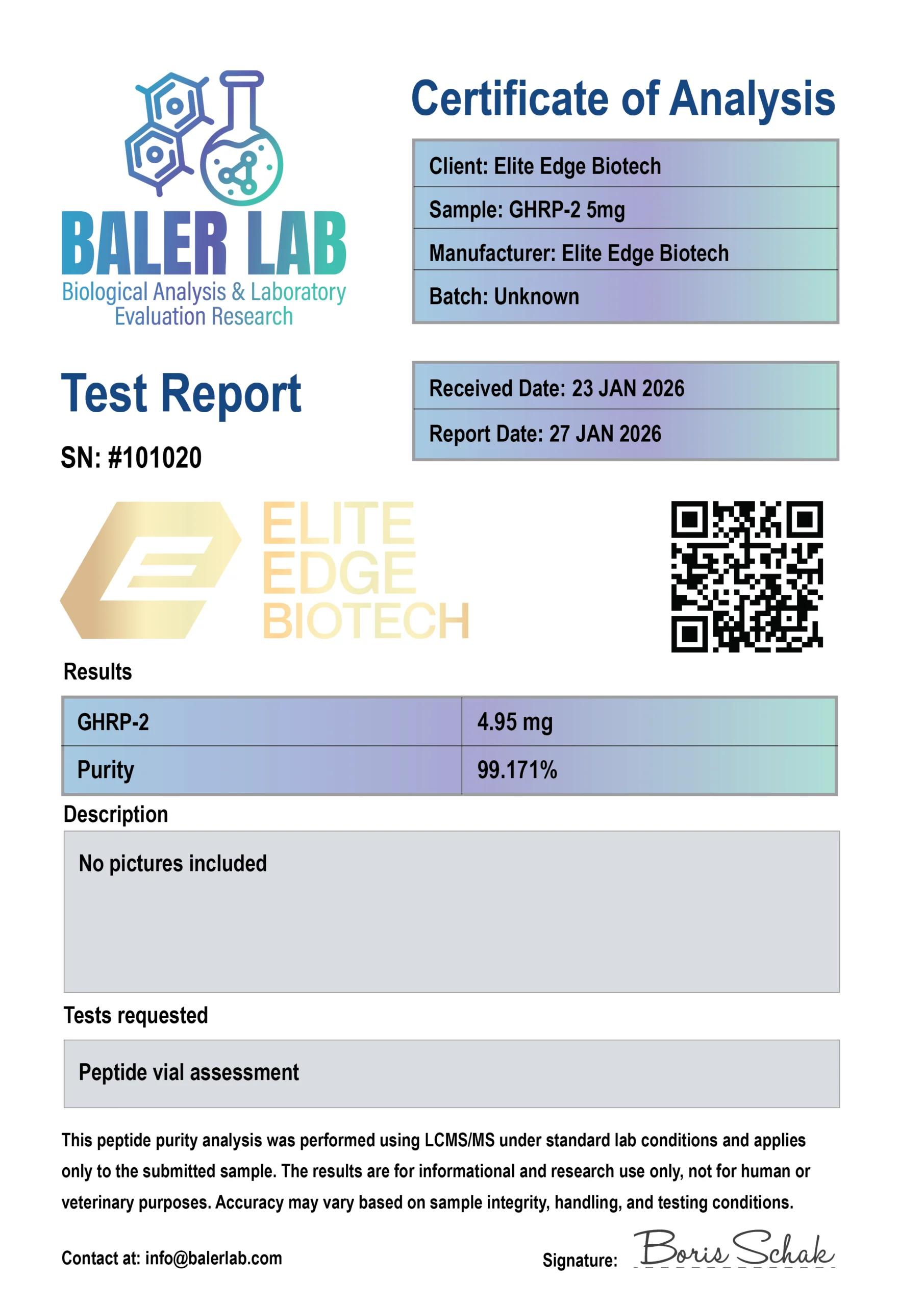 Each batch includes a certificate of analysis provided by an independent third party laboratory based in the US.”